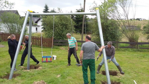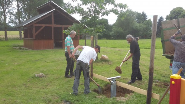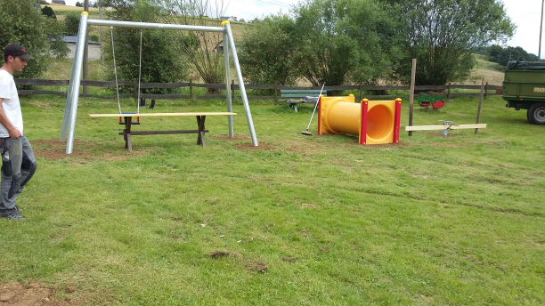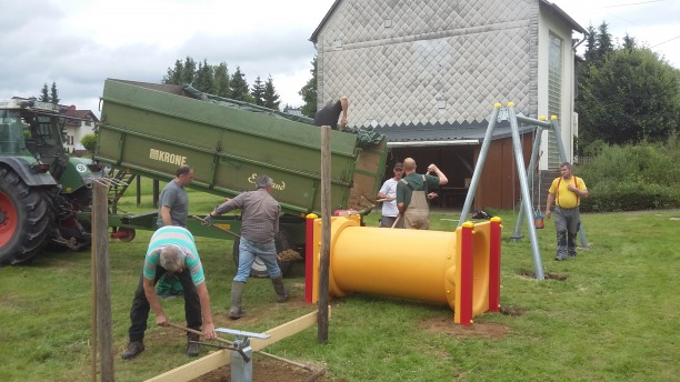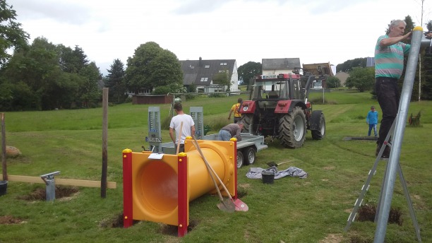 Am heutigen Tag konnte endlich fertiggestellt werden, was in den letzten Tagen und Wochen aufgrund der Wetterlage verschoben und verschoben wurde. Die von der RWE - durch Kommunalbetreuer Thomas Kupp vermittelten - im Rahmen der Aktion "RWE AKTIV VOR ORT" gespendeten Spielgeräte (Schaukel, Wippe, Kriechröhre) wurden aufgebaut. Wenn der Beton ausgehärtet ist, können die Kinder die Geräte in den nächsten Tagen "in Betrieb nehmen".