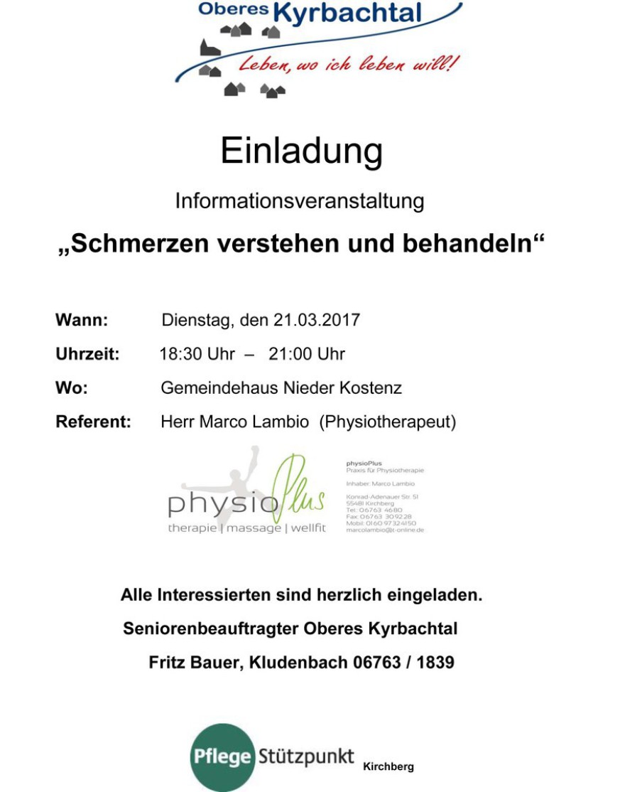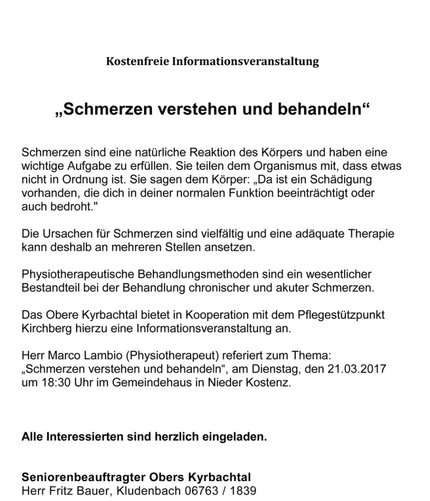 Am 26.10.2016 findet in Nieder Kostenz von 18:30 Uhr bis ca. 21:00 Uhr eine Veranstaltung zu oben genanntem Thema statt. Näheres entnehmen Sie bitte dem angehängten Flyer.