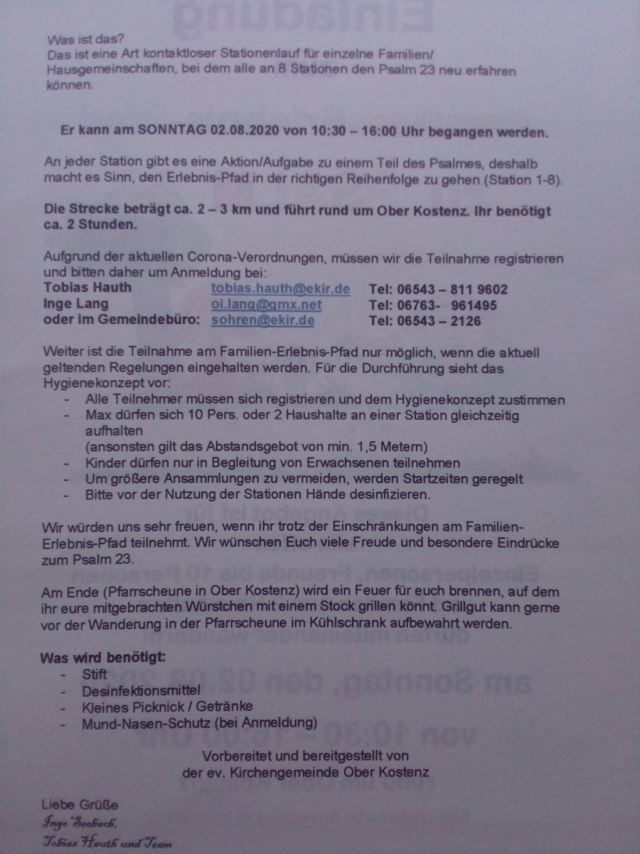Auch wenn der Kindersommer gerade in der jetzigen Situation wichtig für Eltern und besonders die Kinder gewesen wäre, kann im Hinblick auf die Gesundheit der Kinder, Eltern und Betreuer und die sich ständig ändernde Verordnungslage keine sinnvolle Planung stattfinden. So können Buse (Klotten) und Veranstaltungsorte (Kletterwald) derzeit nicht gebucht werden, Sicherheitsabstände (Lesenacht, Kanutour, etc.) wären nicht einzuhalten und Angebote die an andere Veranstaltungen geknüpft sind (Sportfest Ober Kostenz) stehen und fallen mit diesen.