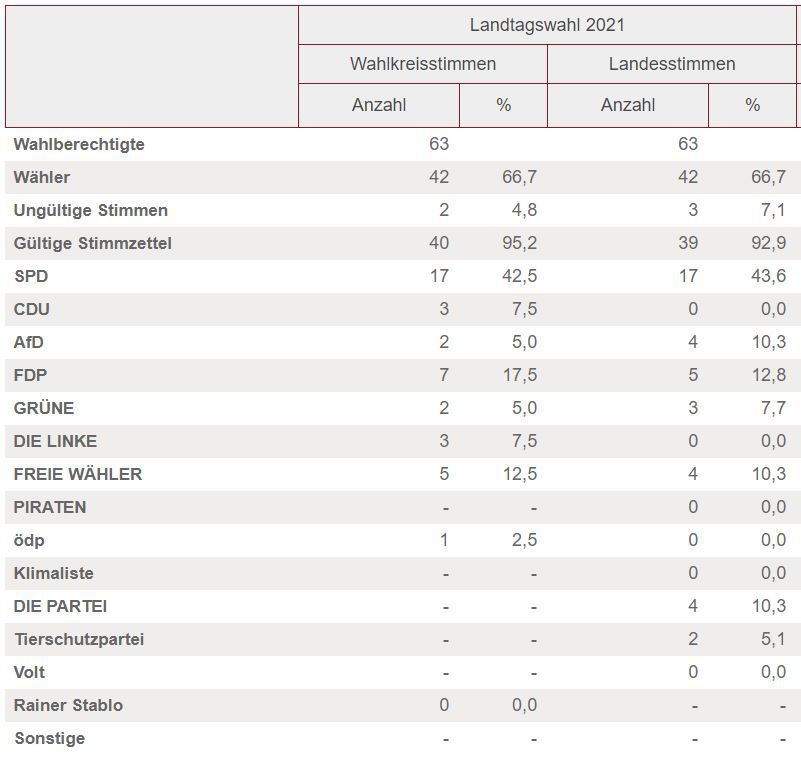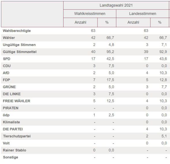 Hier finden Sie die Ergebnisse der Landtagswahl 2021 in der Ortsgemeinde Todenroth: